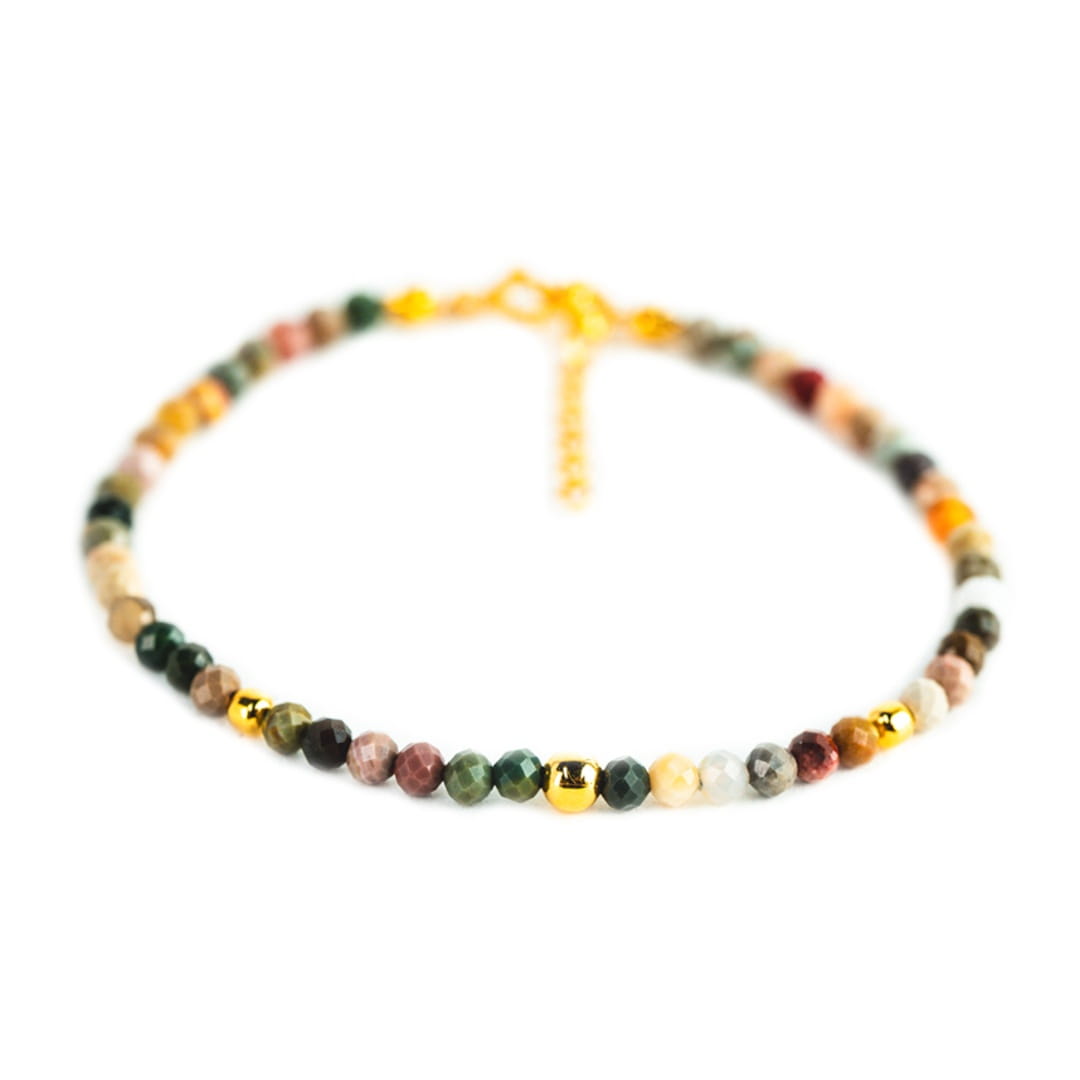 Ręcznie wykonana bransoletka z naturalnych kamieni agatu. Ozdobne przekładki i zapięcie powstały ze srebra próby 925 pokrytego 24-karatowym złotem.